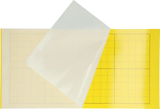 De dubbelzijdige lijmplaat is voorzien van een rastermotief om determinatie te vereenvoudigen.